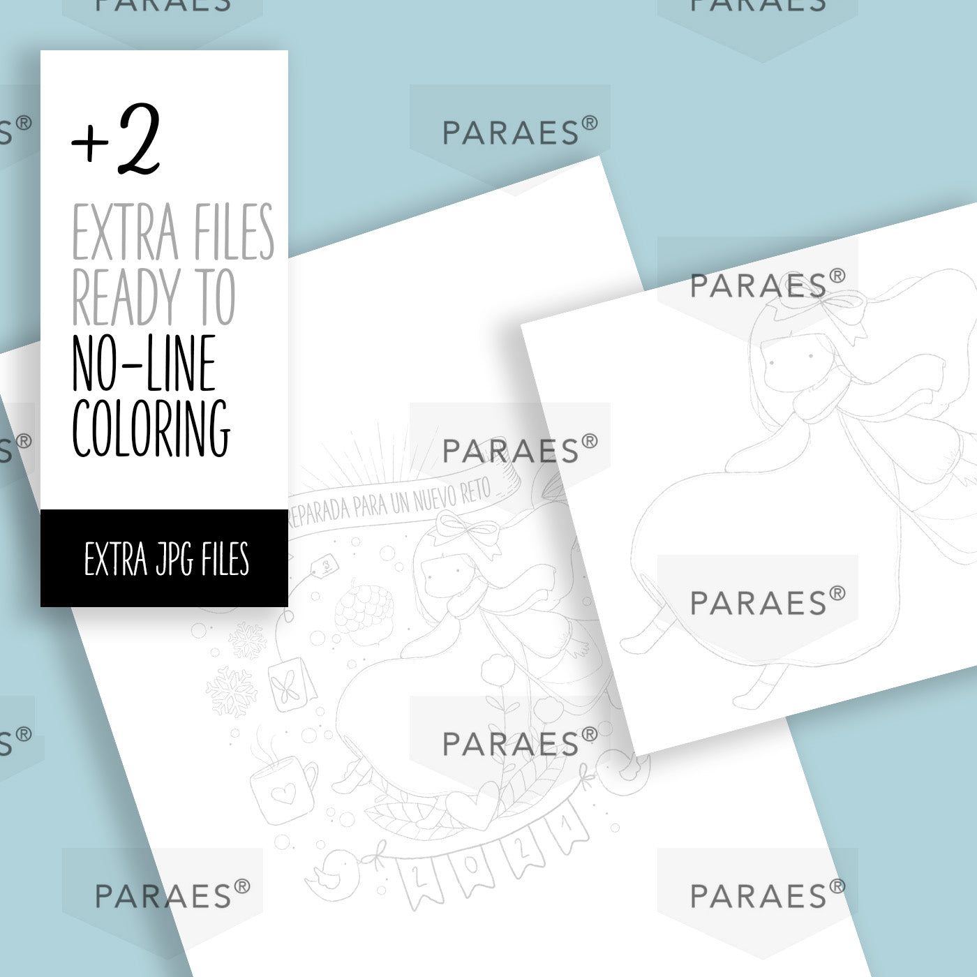 2 Individual files/ separate files. Each in JPG (high resolution 300 dpi) + 2 individual grey files for NO-LINE coloring.