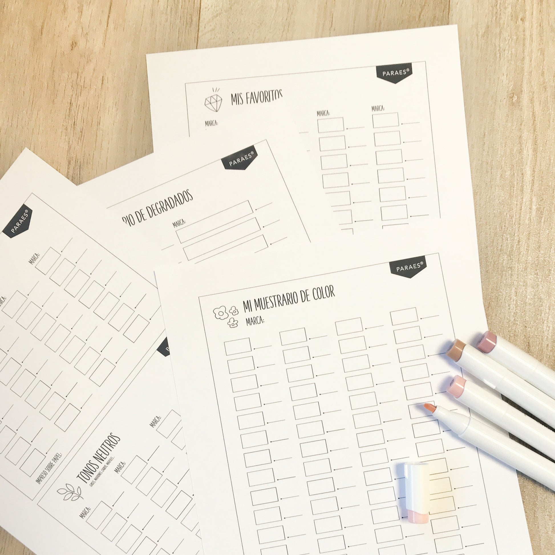 Disponer de un buen muestrario de color es importante a la hora de trabajar. Rellena este muestrario para saber todos los colores que tienes y la tonalidad exacta que dan sobre el papel. Mini consejo: es importante que imprimas este muestrario sobre el papel que suelas usar, pues los colores se alteran dependiendo del papel sobre el que los apliques.