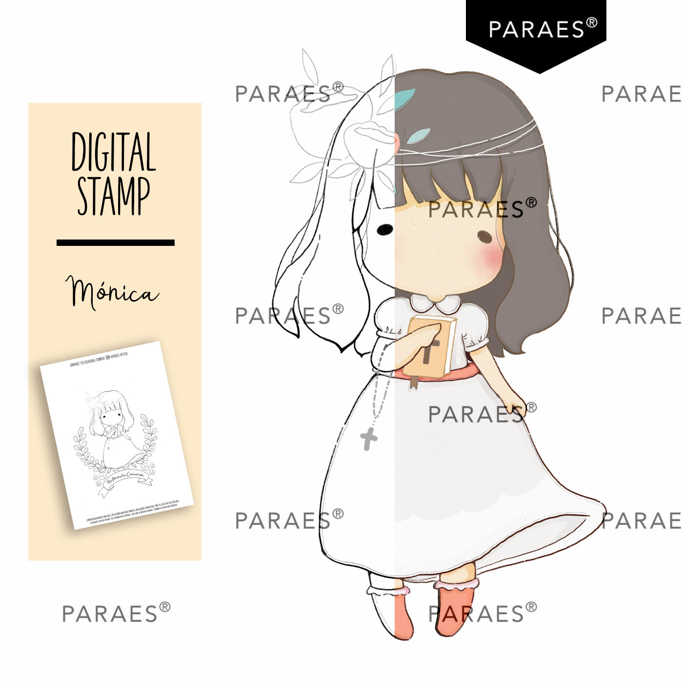 VERSIÓN MÓNICA: La colección de sellos digitales "CHIBI - Mi primera comunión" es perfecta para decorar álbumes, tarjetas de Comunión, mesas dulces... cualquier cosa que necesites. En este descargable encontrarás: Una ilustración grande con línea negra; una ilustración grande en línea gris (ideal para acuarelas), 4 sellos encajados en un Din-A4 con línea negra y 4 sellos encajados en un Din-A4 con línea gris.